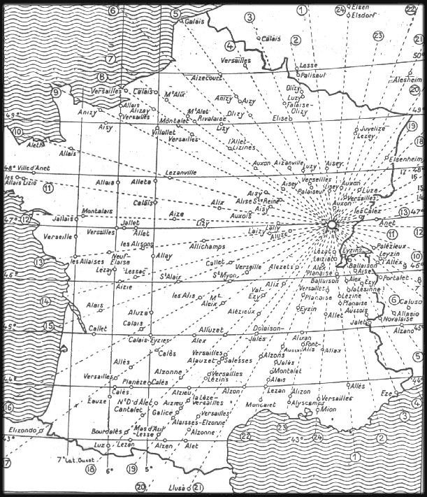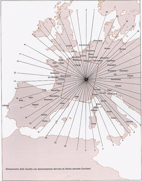 Guichard našel 382 místních jmen, odvozených od Alaise, dalších 47 odvozených od Calais (Cales, Calis), 37 vztahujících se k Versailles, Veiseille, Verceil atd. Watkins, Teudt i Guichard začali pracovat na základě odlišných předpokladů, a přesto dosáhli velmi podobných výsledků. Byli přesvědčeni, že v jejich zemi se nachází křižovatka směrových paprsků, vytvořených z názvů míst, a oba byli přesvědčeni, že tyto paprsky vznikly na základě významného postavení těchto míst.